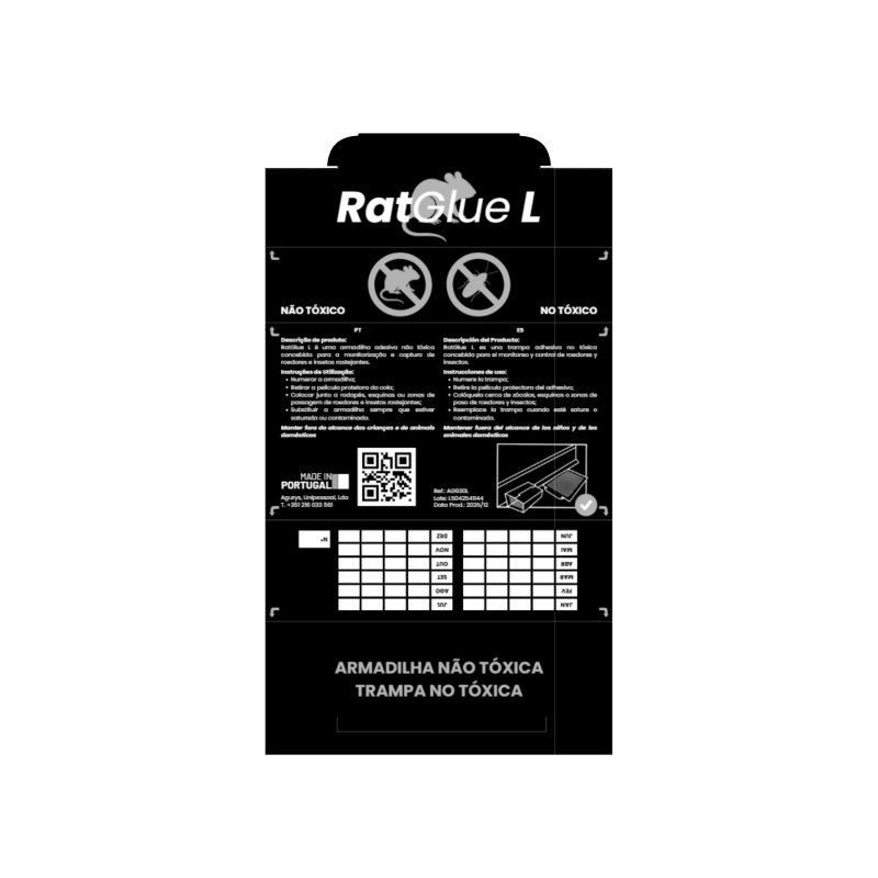 A RatGlue L é uma armadilha adesiva profissional em cartão resistente, com aroma alimentar atrativo, indicada para a captura e monitorização de ratos e insetos em ambientes profissionais.