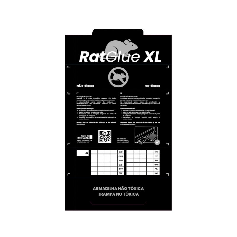 A RatGlue XL é uma armadilha adesiva profissional em cartão resistente, com aroma alimentar altamente atrativo, desenvolvida para a captura e monitorização de ratazanas, oferecendo elevada eficácia e versatilidade em ambientes interiores e exteriores protegidos.