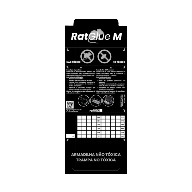 A RatGlue M é uma armadilha adesiva profissional em cartão resistente, com aroma alimentar atrativo, indicada para a captura e monitorização de ratos e insetos em ambientes profissionais.